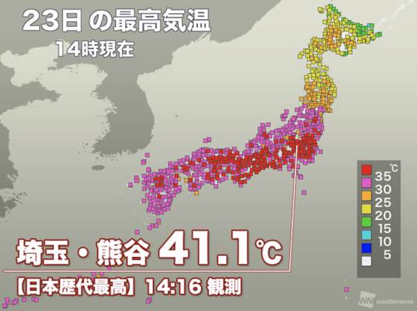 埼玉県熊谷市では、2018年7月23日 (月) の13時前に40℃を突破、その後も気温の上昇は止まらずに、14時16分に41.1℃を観測して、2013年8月12日に記録した高知県江川崎の41.0℃を上回る日本歴代最高気温を記録しました。