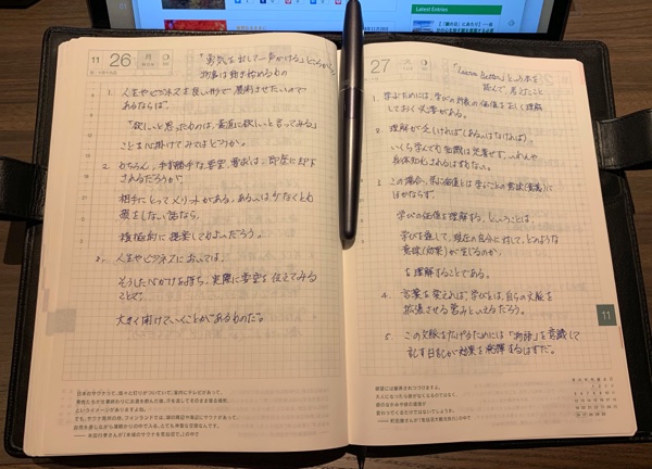 もう1つは、ペン字の練習用として「ほぼ日手帳カズン」というA5サイズの分厚い手帳です。毎朝、1日1ページ用意されたスペースに、毎日配信されるビジネス系メルマガ「平成進化論」のその日のポイントを纏めた「今日のピークパフォーマンス方程式」という部分を、万年筆で書き写しています。ペン字練習を兼ねて。