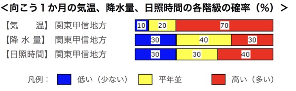 気象庁が、7月2日に発表した関東甲信地方の7月4日から8月3日までの天候見通しによると、前半は平年と同様に曇りや雨の日が多く、後半は晴れの日が多いようです。気温は高めで、降水量は平年並みになりそうです。