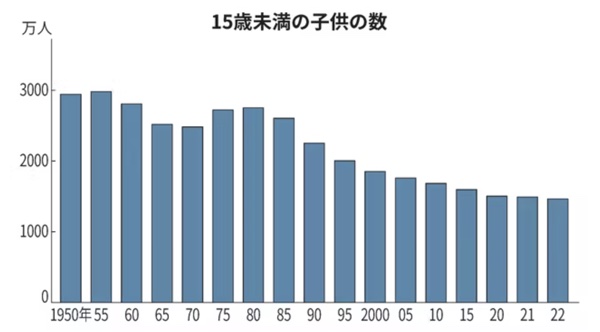 総数はピークだった1954年の2989万人から半減しました。1970年代前半の第2次ベビーブーム前後で増えたもののそれ以降は減り続けています。