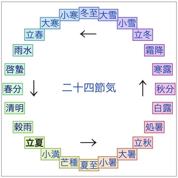 1年を24等分に割って24の区分が作られ、そのうちの6つずつで一つの季節を表します。「立春」が「春」の始まりで一年がスタートします。その後6つずつ「春」「夏」「秋」「冬」と4つの季節が進みます。