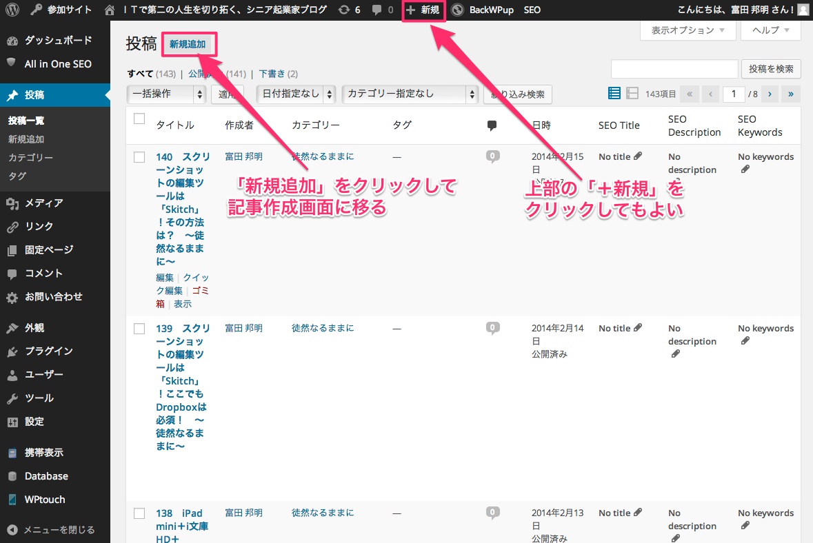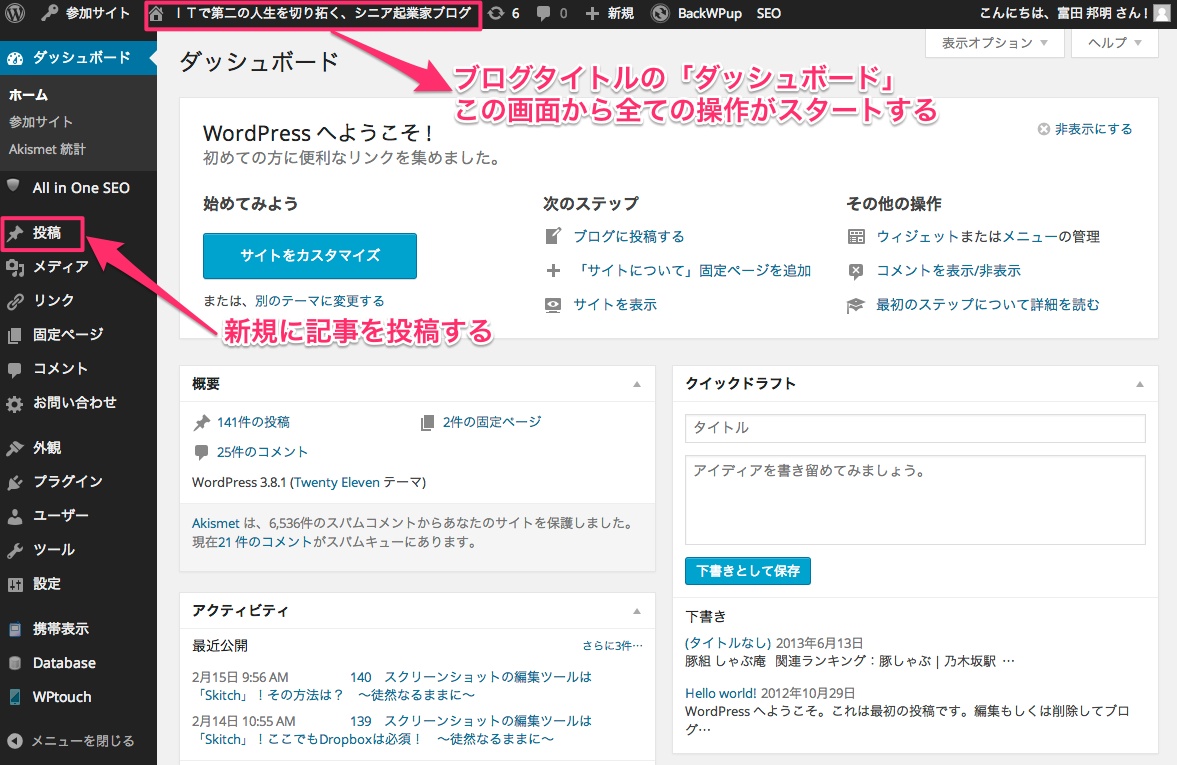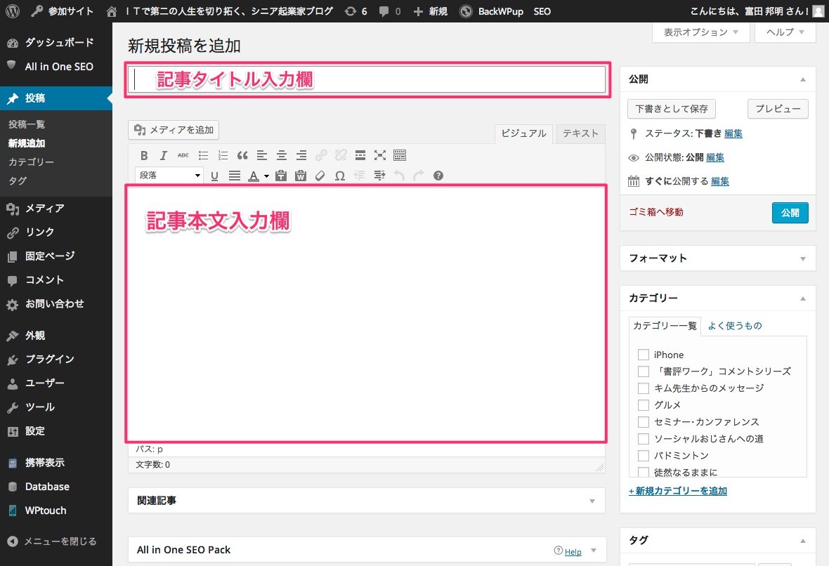 では、早速ブログ記事をアップしている様子をご紹介します。WordPressは事前に設定することがいくつかありますが、一度設定してしまえばワープロで文章を打って、図や画像を文中に挿入して文書を作成するような感覚でブログ記事をアップすることができます。