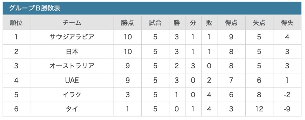 そして、日本−サウジアラビア戦終了後、オーストラリアがタイと引き分けた (予想外!) 結果、日本は、最終予選グループBでサウジアラビアと勝ち点10で並び、得失点差で2位につけています。