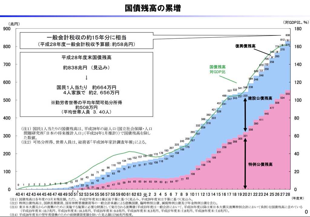 次に、公債残高の推移グラフを見てみます。特例公債とあるのが赤字国債です。平成28年度末の見込みで、総額838兆円の借金残高となっています。