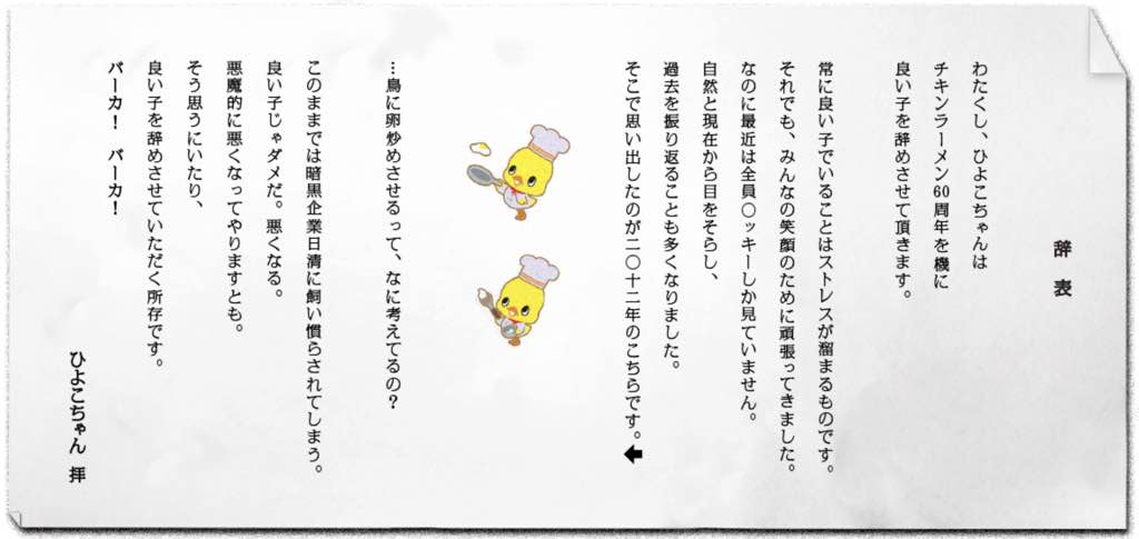 また、チキンラーメンのキャラクターとして長年愛されてきた「ひよこちゃん」が突如豹変し、大きな話題になりました。それは、チキンラーメンが今年60周年を迎えたことに理由があるそうです。(こちらのサイト参照)
