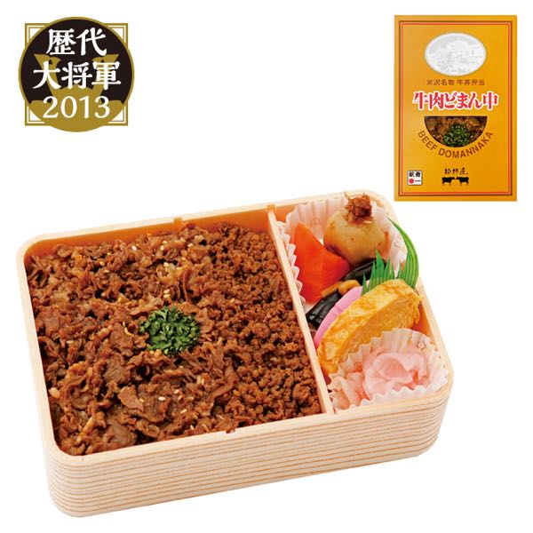 山形生まれのお米「どまんなか」の白御飯を、米沢の名物である牛肉にちなみ、甘辛な牛肉煮と牛そぼろで覆い、サトイモ、ニンジン、ニシン昆布巻、かまぼこ、玉子焼、大根桜漬を添えています。(こちらの記事参照)