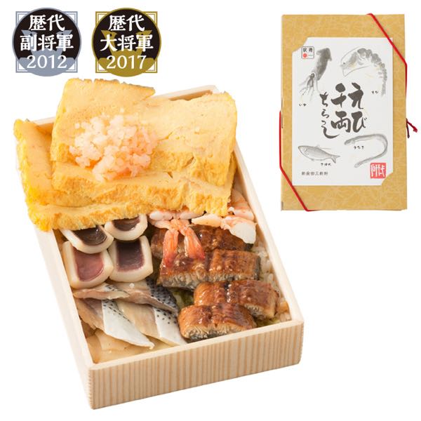 最初は蓋を開けると玉子焼きしか見えないのでビックリします。でも、その下には昆布が敷かれた寿司飯の上に、手間をかけて仕込まれた蒸しえび、うなぎの蒲焼き、こはだの薄切り〆め、塩いかの一夜干しが一つずつ手作業で載せられています。(こちらの記事参照)