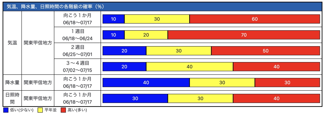 気象庁が、6月16日に発表した関東甲信地方の6月18日から7月17日までの天候見通しによると、平年と同様に曇りや雨の日が多く、気温は高めで、降水量はやや少なめになりそうです。
