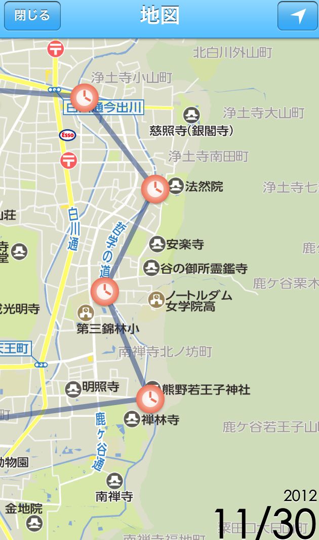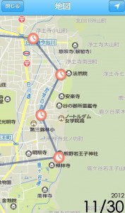 まず、iPhone5のGPSでトラッキングした散策の軌跡です。