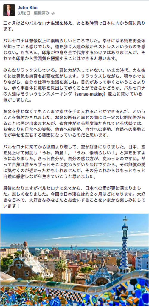 ジョン・キム先生は、バルセロナでの3ヶ月の生活を終え、先月初旬日本に帰国されました。