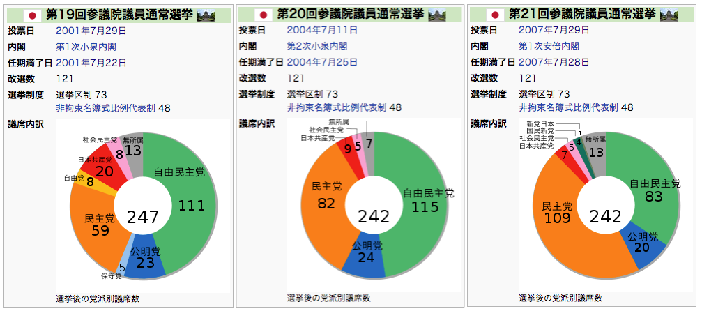 上記の通り、2001年の今日行われた第19回選挙では小泉ブームで圧勝、2007年の今日行われた第21回選挙では自民党の大敗、と明暗が分かれています。