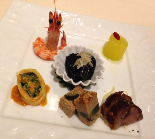差額をお支払いしてお願いした、小菜盛り合わせです。真ん中が、茄子の青山椒、そのすぐ下がピータン、左回りに菊の葉・玉子巻き、海老、冬瓜のクチナシ煮、煮チャーシューです。それぞれの味わいが絶妙でした。