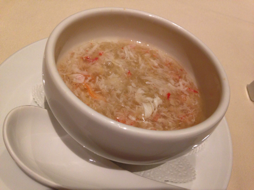 蟹肉と卵白のフカヒレスープです。淡泊なフカヒレに絡む蟹肉と卵白の優しい味わいが口の中に広がります。