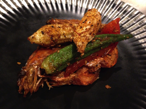 有頭海老と彩り野菜のスパイシー揚げです。その名の通り、ピリッとスパイシーな食感が舌を刺激します。ついつい紹興酒が進みます。(^^;
