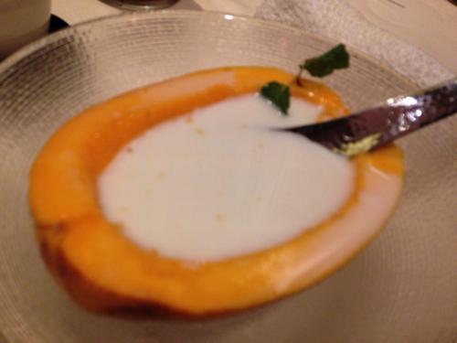 酔っ払っていてピンボケになってしまいました。コースについていないデザートです。タピオカ入りココナッツミルク マンゴーの器で を頼みました。それはそれは美味でした。