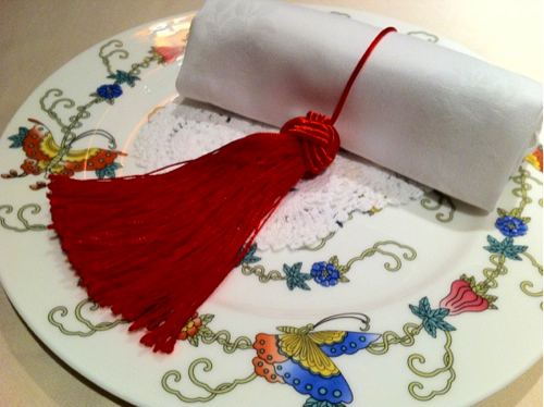 今回は、以前にも利用させてもらった6人用の個室でした。テーブルにはお皿にナプキンが品良く載っています。