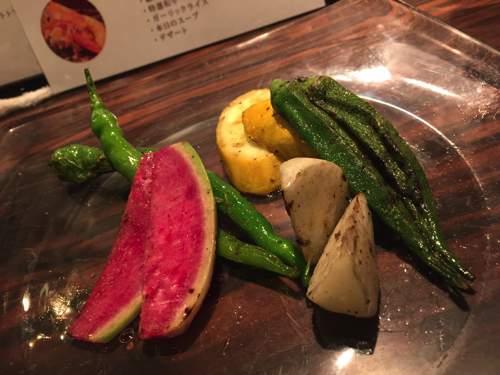 まず、アラカルトの料理長おまかせ野菜グリルです。インド原産の炭でやさしく焼き上げてくれます。味もやさしいです。
