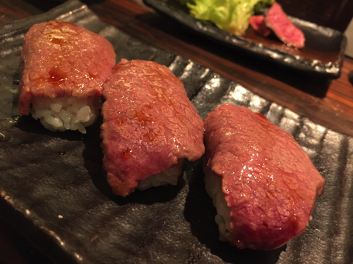 これは、アラカルトの肉寿司です。とろけます。美味いです。絶品です。これも是非食べないと!