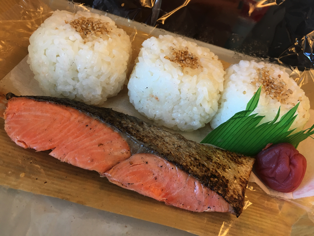 実際に食したのは「鮭弁当」650円です。魚沼産こしひかりのごま塩にぎり3個と鮭塩焼き、梅干がついています。